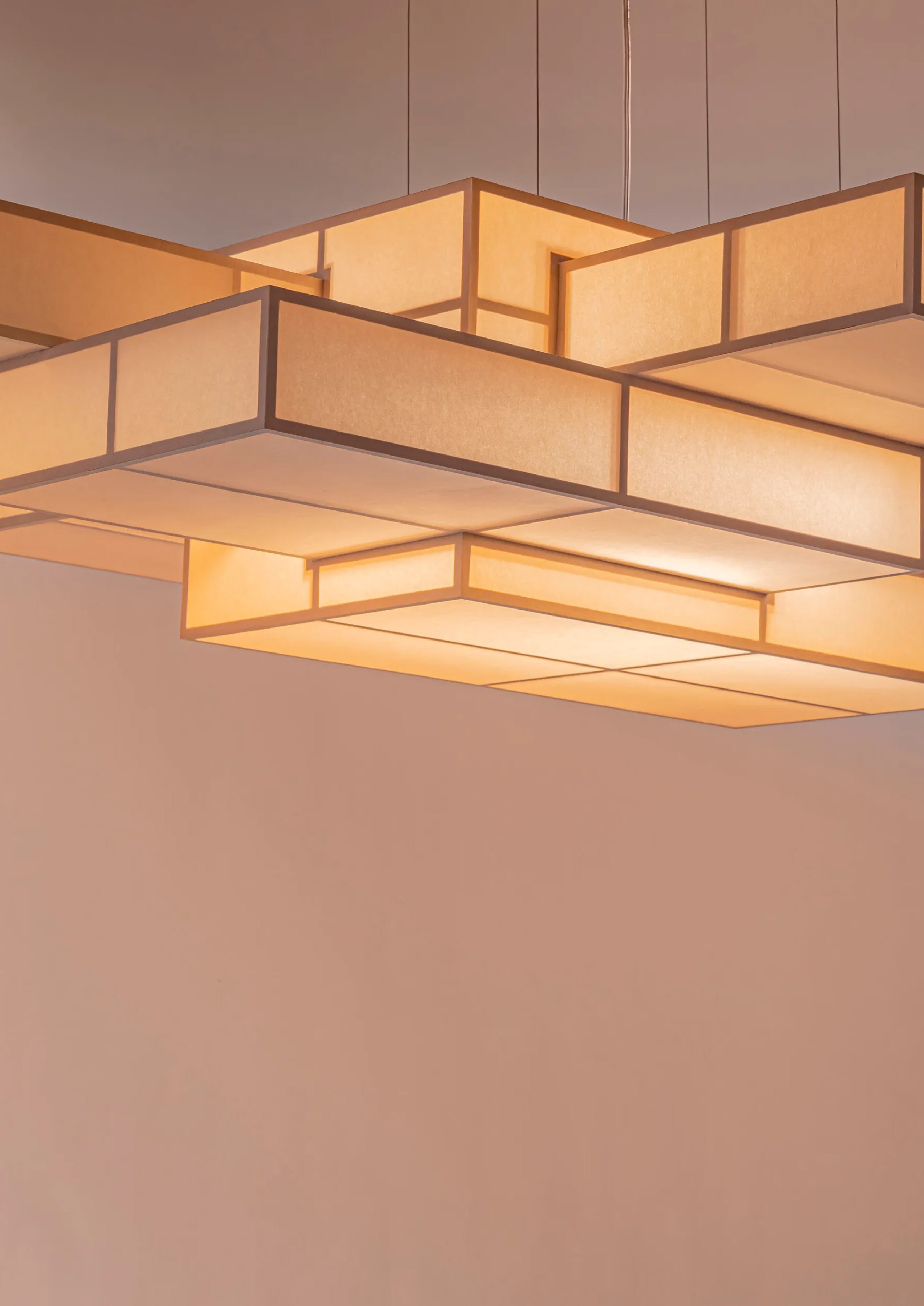 Pendant combining Japan’s woodworking technique with Mino wash, traditional Japanese paper. By stacking and intentionally offsetting these boxes, an abstract, 3D state of “imperfection” is achieved - evoking the light airiness of clouds in the sky, constantly shifting. Three sizes available.
