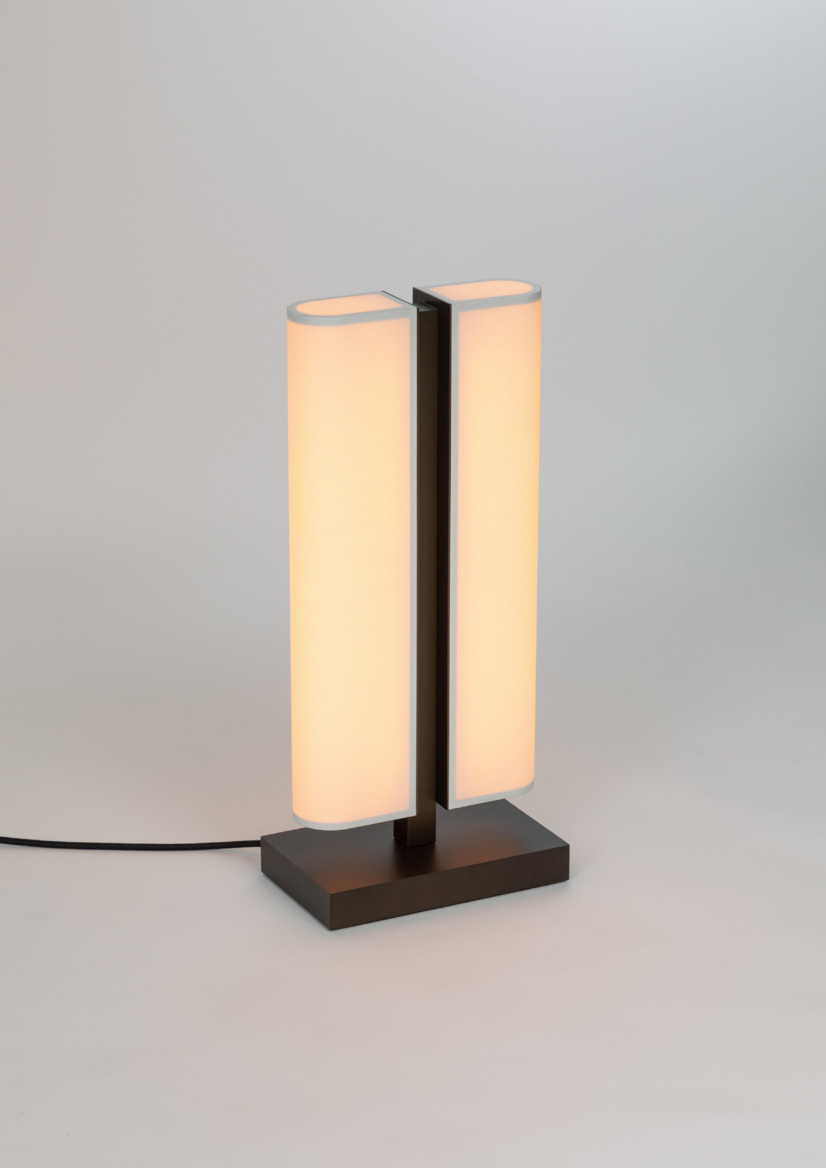 Table lamp with aluminum and brass structure. Shade is in white paper diffusion material. Collection also includes sconce, pendant and floor lamp.